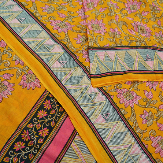 Indian Vintage Sari Yellow Printed 100% Pure Cotton Saree Craft Fabric 5Yd Soft Sewing Sarong Wrap Boho Dress Making Crafting Quilting
