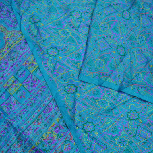 Indian Vintage Blue Saree Pure Crepe Silk Printed Sari 5yd Sewing Abstract Soft Craft Fabric Wrap Dress making Crafting Quilting Upcycle