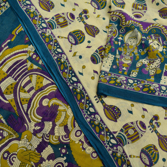 Indian Vintage Sari Green & Beige Kalamkari Print Sari Pure Cotton Saree Craft Fabric 5Yd Soft Dancing Lady Ethnic Dress Making Crafting