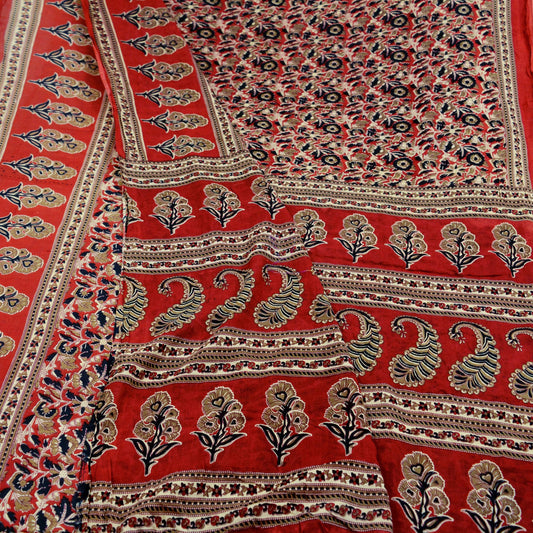 Indian Vintage Red Saree Printed Pure Cotton Indian Sari Craft Fabric Soft 5Yd Sewing Sarong Wrap Boho Floral Quilting Crafting Upcycle
