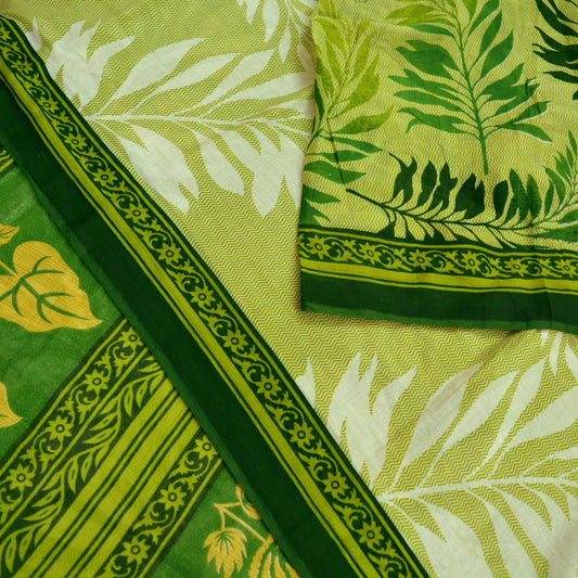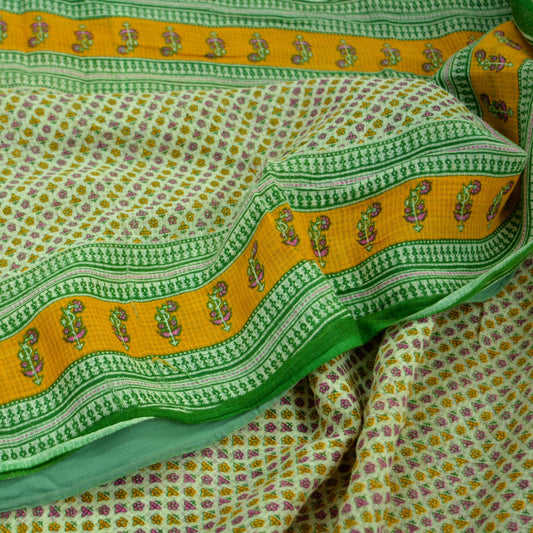 Indian Vintage Sari Green & Ivory Printed Pure Cotton Sarees 5Yd Craft Fabric Soft Sewing Sarong Wrap Boho Upcycle quilting Dress making