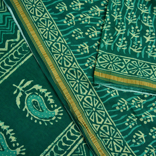 Indian Vintage Sari Green Pure Cotton Hand Bagru Printed Sarees 5Yd Craft Fabric Soft Sewing Sarong Dress Making Quilting Crafting