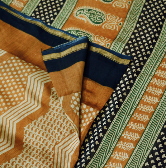Indian Vintage SariSaffron & Black Block Printed Sari Pure chanderi Silk Saree Fabric 5Yard Floral Soft Golden Zari