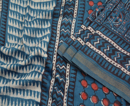 Indian Vintage Sari Blue & Beige Printed 100% Pure Cotton Sarees Craft Fabric 5Yd Sewing Soft Sarong Wrap Floral Dress Making Shrug Quilting