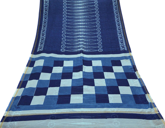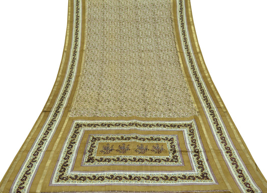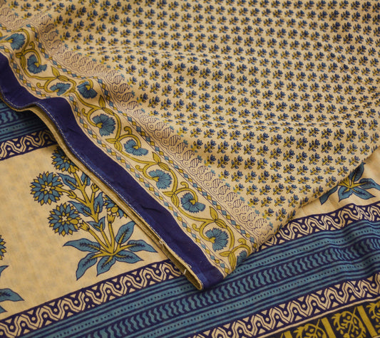 Indian Vintage Beige & Blue Saree Pure Silk Printed Sari 5yd Sewing Craft Fabric Dress Making Soft Wrap Dress Designing Crafting Upcycle