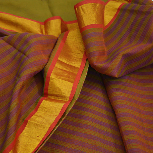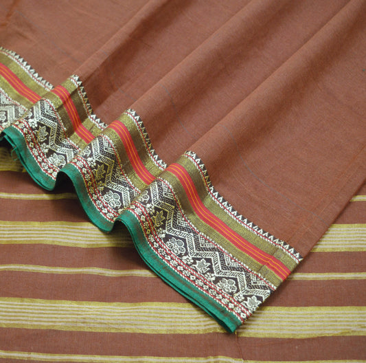Vintage Sari Brown Pure Cotton Hand Woven Saree Golden Zari 5Yard Soft Floral Ethnic
