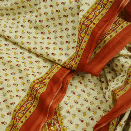 Indian Vintage Sari Ivory & Orange Printed Pure Cotton Saree Fabric Soft Floral 5Yd Sarong Wrap Boho Fabric Kimono Soft