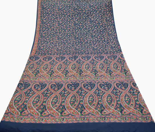 Women Vintage Blue Saree Pure Chiffon Silk Printed Sari Craft Fabric Sewing 5Yd Soft Dress Making Floral Quilting Crafting Upcycle
