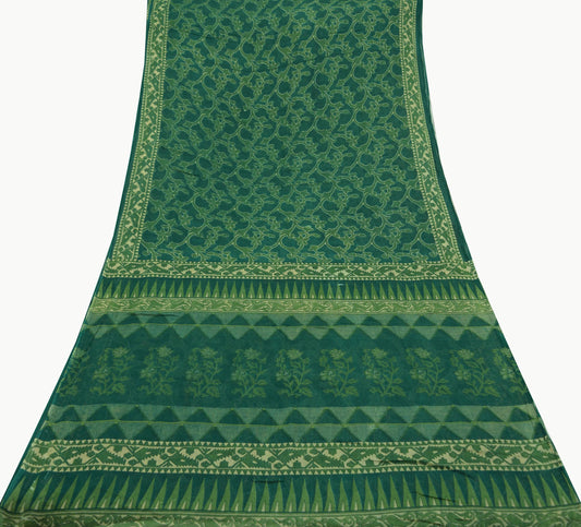 Indian Vintage Green Saree Printed Pure Cotton Sari Craft Fabric Soft 5Yd Sewing Sarong Wrap Boho Floral Dress making Crafting Quilting