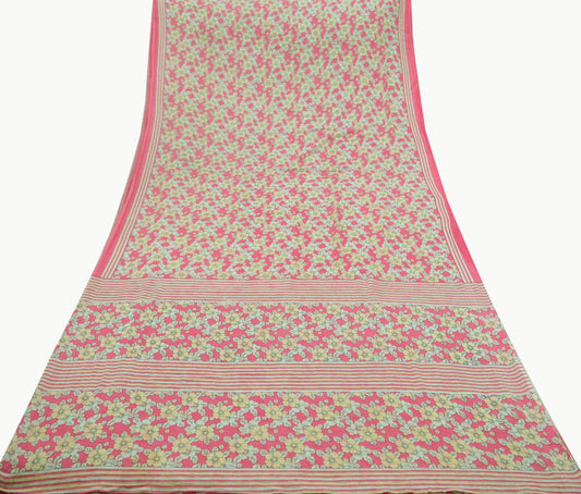 Indian Vintage Sari Ivory & Pink Printed Pure Cotton Saree Craft Fabric 5Yd Soft Sewing Sarong Wrap Boho Floral Dress making Crafting