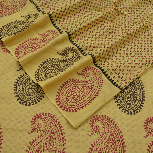 Indian Vintage Sari Beige Pure Cotton Hand Block Printed Sarees 5Yd Craft Fabric Soft Sewing Sarong Dress Making Quilting Crafting Upcycle