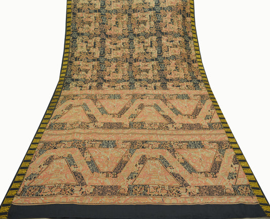 Indian Vintage Black & Beige Saree Pure Silk Block Printed Sari Craft Fabric 5yd Sewing DressMaking Soft Floral Quilting Crafting Upcycle