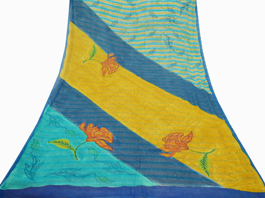 Indian Vintage Saffron & Blue Saree 100% Pure Georgette Silk Printed Sari Sewing 5yd Craft Soft Dress Designing for Crafting Floral