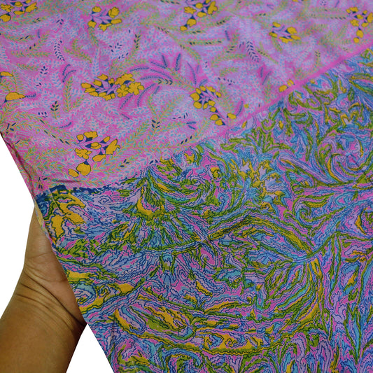 Indian Vintage Pink & Blue Saree 100% Pure Silk Printed Sari Craft Fabric 5yd Sewing Dress Making Soft Floral Abstract Quilting Crafting