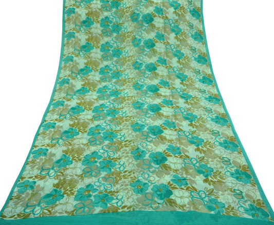 Indian Vintage Saree Ivory & Green Pure Georgette Silk Printed Sari Sewing 5yd Craft Soft Floral Dress Designing for Crafting