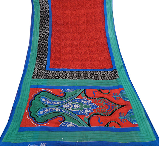 Indian Vintage Sari Red & Blue Printed 100% Pure Cotton Saree Craft Fabric 5Yard Sewing Sarong Wrap Boho Floral