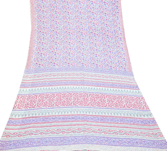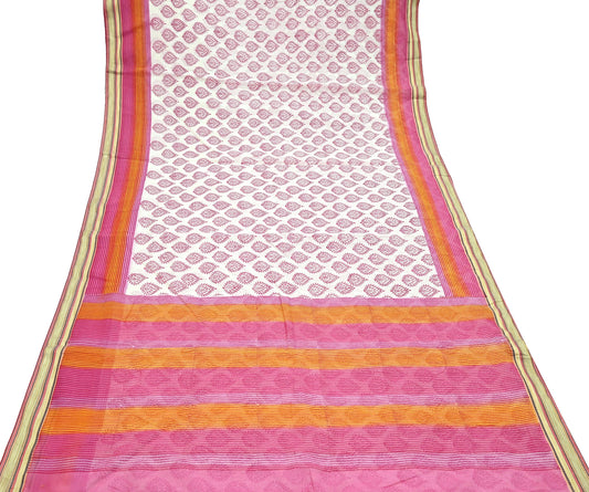 Indian Vintage Sari White & Pink Printed Pure Cotton Sarees Craft Fabric 5Yd Sewing Sarong Wrap Boho Floral Quilting Dress making