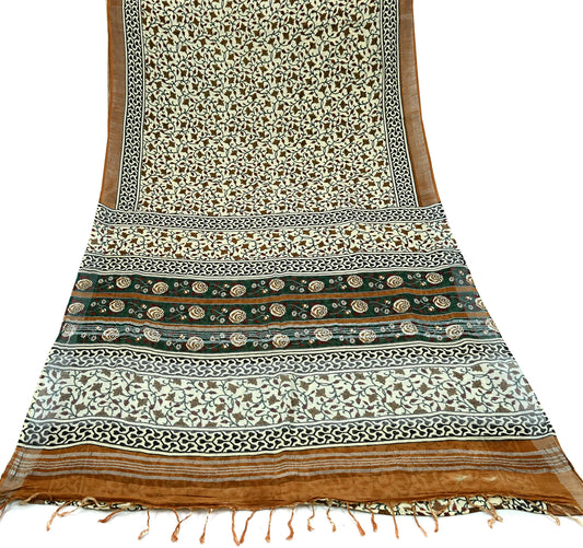 Indian Vintage Ivory & Brown Sarees Pure Cotton Printed Sari 5yd Sewing Craft Fabric DressMaking Soft Crafting Quilting Upcycle Border