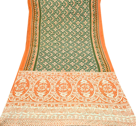 Indian Vintage Sari Green & Orange Printed Sarees Pure Cotton Craft Soft Fabric 5Yard Sewing Sarong Wrap Boho Floral Upcycle Dress making