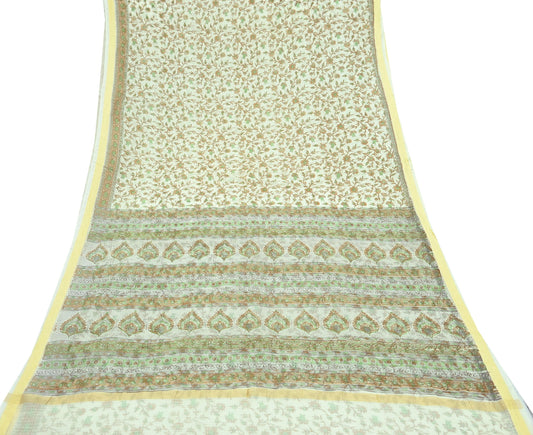 Indian Vintage Beige Sari Printed Pure Cotton Saree Craft Fabric 5Yd Soft Sewing Sarong Wrap Boho Fringes Dress making Crafting Quilting