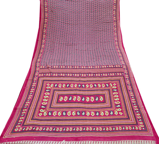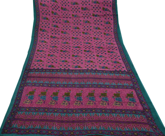 Indian Vintage Sari Pink & Green Printed 100% Pure Cotton Sarees Craft Fabric 5Yd Soft Sewing Sarong Wrap Floral Boho Quilting Crafting Used