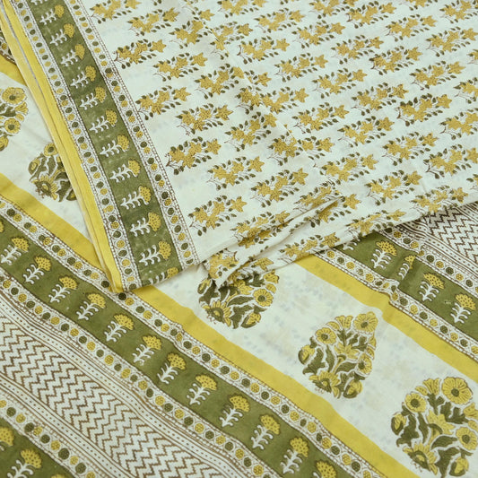 Indian Vintage Ivory Sarees Pure Cotton Block Printed Sari 5yd Sewing Craft Fabric DressMaking Soft Crafting Quilting Upcycle Zari