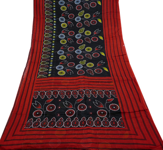 Indian Vintage Sari Red & Black Printed 100% Pure Cotton Saree Craft Fabric 5Yard Sewing Sarong Wrap Boho Floral