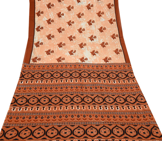 Indian Vintage Saffron & Brown Saree Batik Printed 100% Pure Cotton Sari Craft Fabric Soft 5Yd Sewing Sarong Wrap Boho Dress Making Upcycle