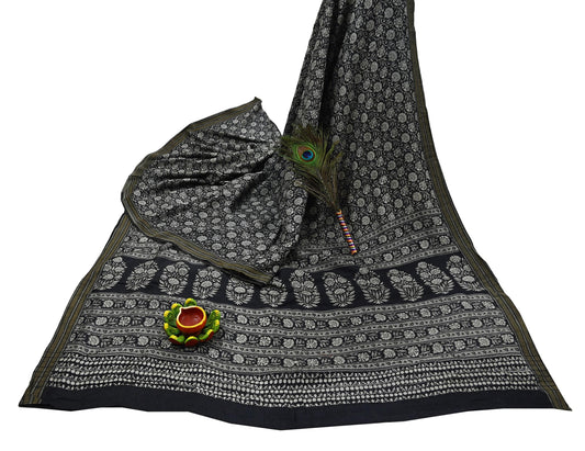 Indian Vintage Black & Gray Saree Pure Woolen Woven Printed Sari Warm Craft Fabric 5Yd Woven Border Dress making Crafting Dress Designing