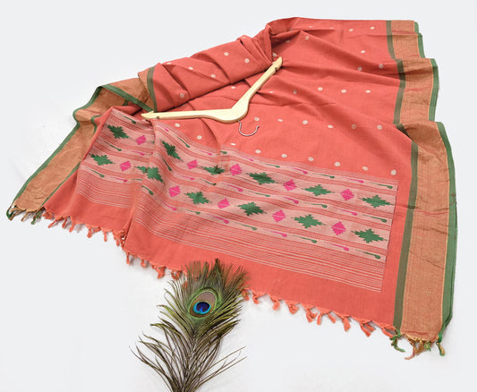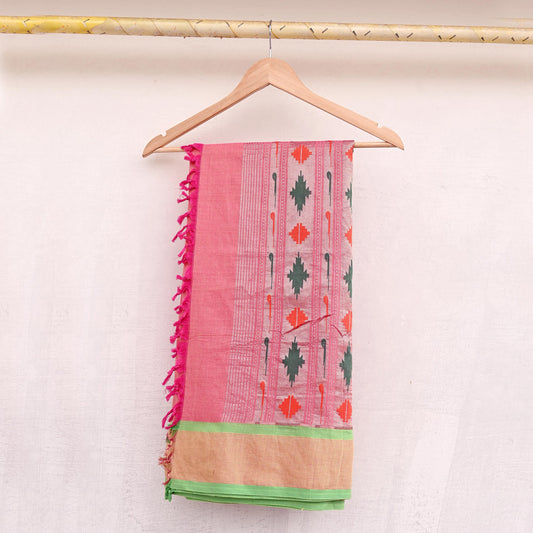 Indian Vintage Dupatta Pink & Peach Pure Cotton Long Stole Handloom Paithani Dupatta Scarves Veil Tissue Silk Muniya Border