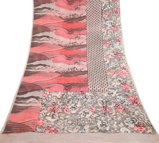 Indian Vintage Peach & Gray Saree Pure Khadi Silk Handloom Printed Sari Fabric 5yard Ethnic Wear Sari Floral