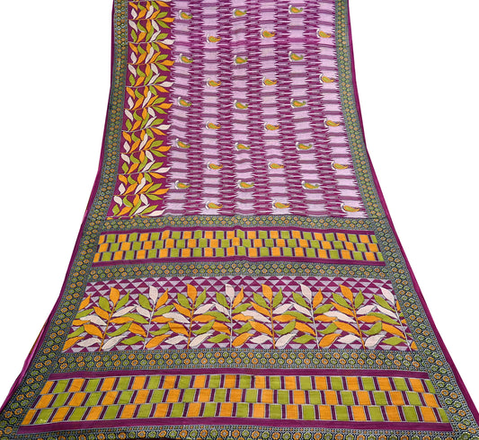 Vintage Printed Pure Cotton Saree 5 Yard Purple Green Yellow Fabric Indian Ethnic Block Print Textile for Sewing & Dressmaking