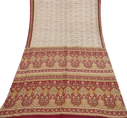 Indian Vintage Beige & Maroon Saree 100% Pure Silk Printed Sari Craft Fabric 6yd Sewing Floral Soft Dress Designing for Crafting