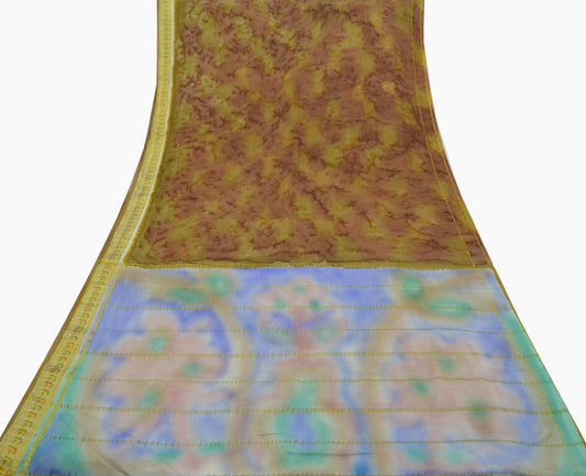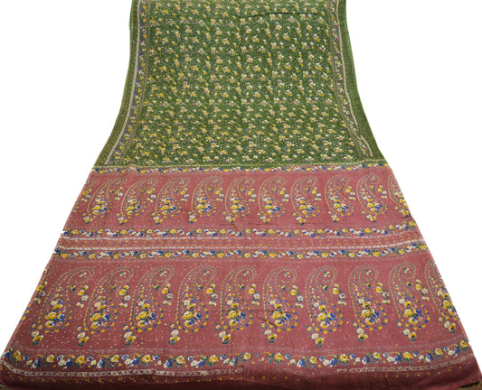 Indian Vintage Green & Brown Saree Pure Silk Printed Sari 5yd Sewing Zari Craft Fabric Dress Making Soft Crafting Quilting