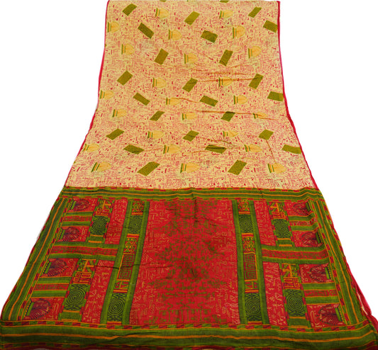 Indian Vintage Sari Green & Red Printed Pure Cotton Saree Craft Fabric 5Yd Sewing Sarong Wrap Boho Floral Crafting Upcycle Quilting Used