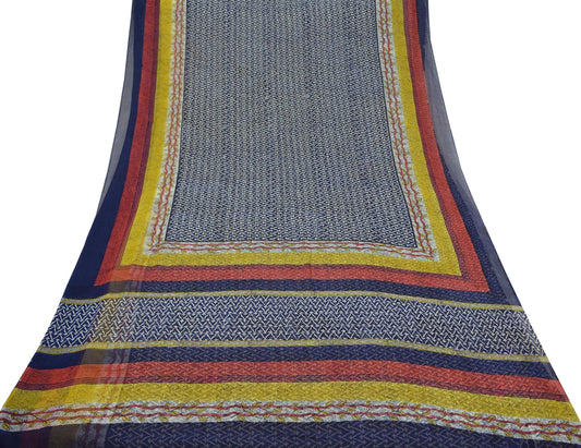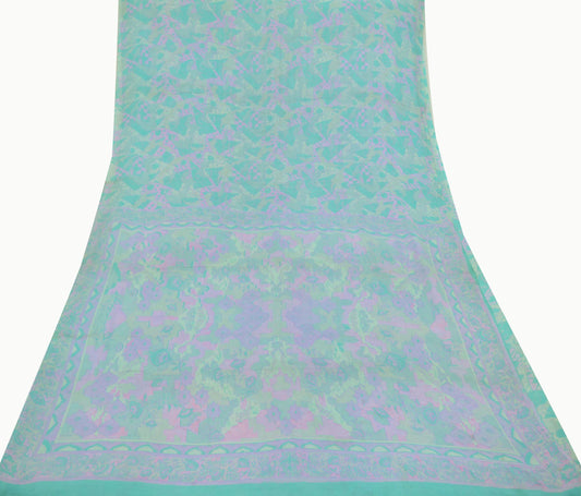 Women Vintage Blue Saree Pure Chiffon Silk Printed Sari Craft Fabric Sewing 5Yd Soft Dress Making Floral Crafting Upcycle Quilting