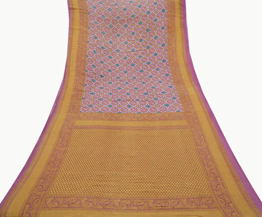 Indian Vintage Sari Beige & Purple Pure Cotton Printed Sarees Craft Fabric Soft 5Yd Sarong Wrap Boho Fabric Kimono Quilting Crafting Upcycle