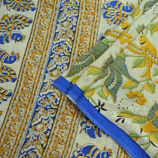 Indian Vintage Saree Ivory Block Printed Pure Cotton Sari Craft Fabric Soft 5Yd Sarong Wrap Peacock Floral Dress Making Quilting Crafting