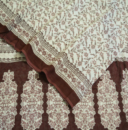 Indian Vintage Sari White & Brown 100% Pure Cotton Printed Saree Craft Fabric 5Yd Soft Sewing Sarong Wrap Boho Floral Quilting Crafting