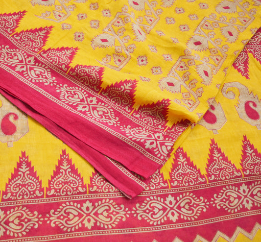 Indian Vintage Sari Pink & Yellow Printed 100% Pure Cotton Saree Craft Soft Fabric 5Yard Sewing Sarong Wrap Boho