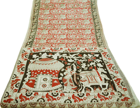 Indian Vintage Sari Red & Ivory Block Printed Pure Cotton Saree Craft Soft Fabric 5Yard Sewing Sarong Wrap Boho Paisley