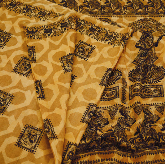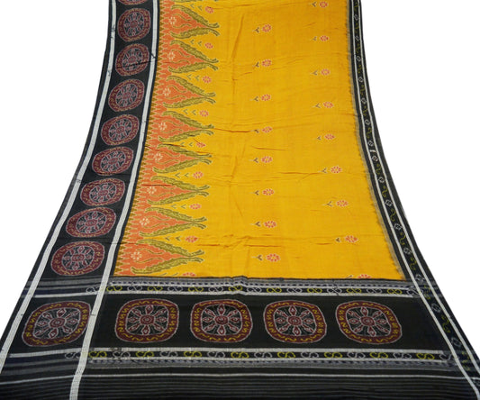 Indian Vintage Black & Mustard Hand woven Sambalpuri Ikat Saree Pure Cotton Indian Sari Fabric 5Yard Ethnic Chackra Border