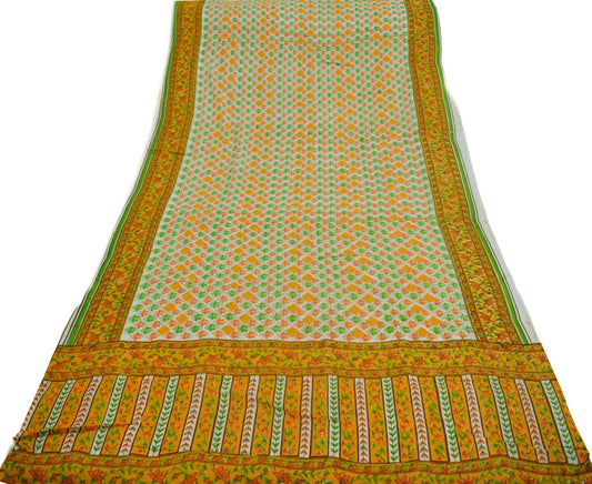 Indian Vintage Sari Green & Ivory Printed Pure Cotton Sarees 5Yd Craft Fabric Soft Sewing Sarong Wrap Boho Upcycle quilting Dress making