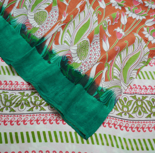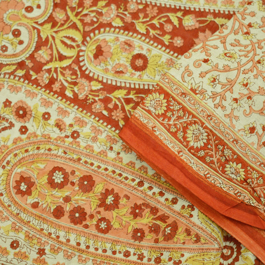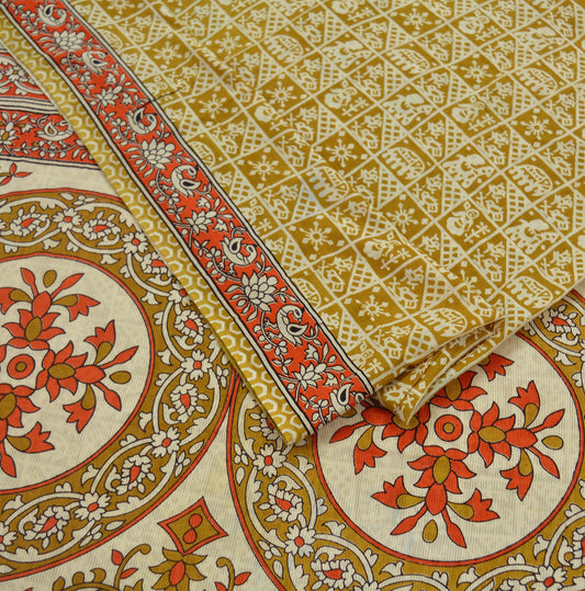 Indian Vintage Sari Ivory/Orange Pure Cotton Printed Saree 5Yd Craft Fabric Soft Paisley Sarong Wrap Boho Kimono Quilting Dress Making