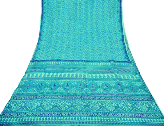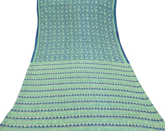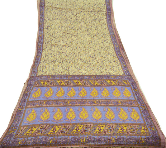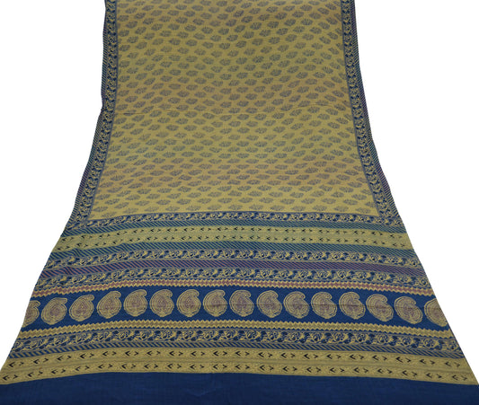 Indian Vintage Beige & Blue Saree Pure Crepe Silk Printed Sari 5yd Sewing Paisley Soft Craft Fabric Wrap Dress Making Quilting Crafting