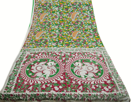 Indian Vintage Sari Kalamkari Printed Pure Cotton Saree Fabric Soft Floral 5Yd Sarong Wrap Fabric Peacock