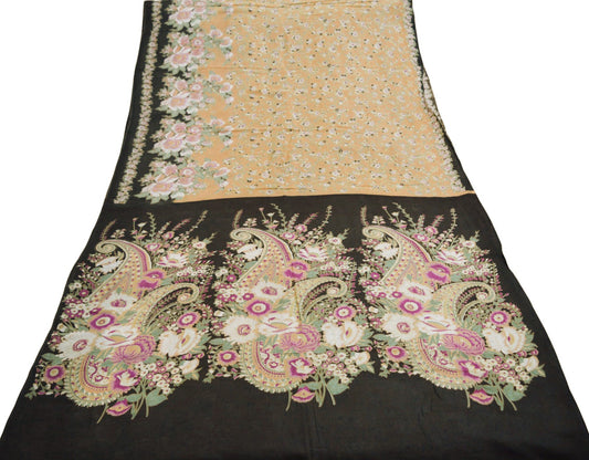 Indian Vintage Sari Beige & Black Printed Pure Cotton Saree Fabric Soft Floral 5Yd Sarong Wrap Boho Fabric Kimono Soft