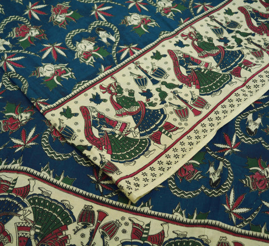 Indian Vintage Sari Blue Kalamkari Printed Pure Cotton Saree Fabric Soft Floral 5Yd Sarong Wrap Fabric Peacock