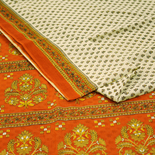 Indian Vintage Sari Ivory & Orange Printed Pure Cotton Saree Fabric Soft Floral 5Yd Sarong Wrap Boho Fabric Kimono Soft