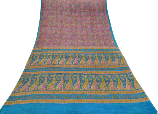 Indian Vintage Pink & Blue Saree 100% Pure Silk Printed Sari Craft Fabric 6yd Sewing Dress Making Soft Floral Paisley Quilting Crafting